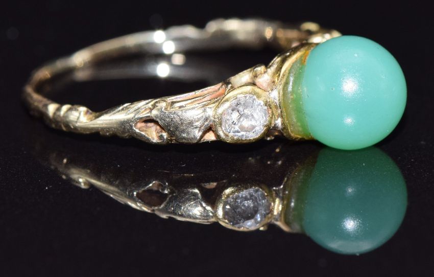 A 19thC yellow metal ring set with two diamonds and a bead, size J, 1.9g