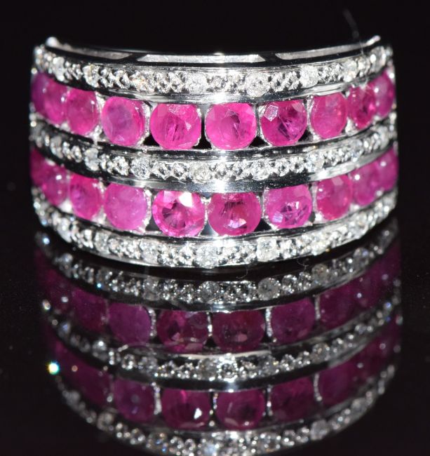 A 9ct white gold ring set with rubies and diamonds, size M, 6.4g