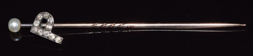 Victorian stick pin set with a pearl and old cut diamonds in the letter 'P'