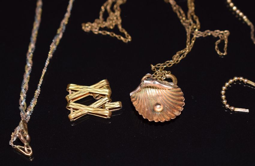 A 9ct gold necklace, section of 9ct gold necklace, 9ct gold bracelet and a 9ct gold shell pendant, 10g