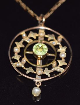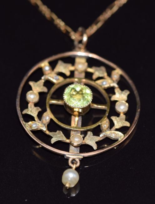 Edwardian 9ct gold pendant set with a round cut peridot, seed pearls and a drop pearl, on 9ct gold chain, 5g