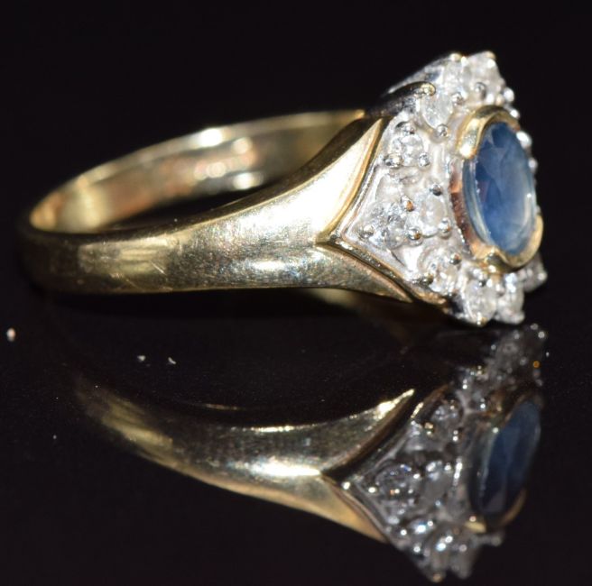 A 9ct gold ring set with an oval sapphire and diamonds, size M, 3.8g