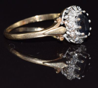 A 9ct gold ring set with an oval sapphire and diamonds, size N 2.3g