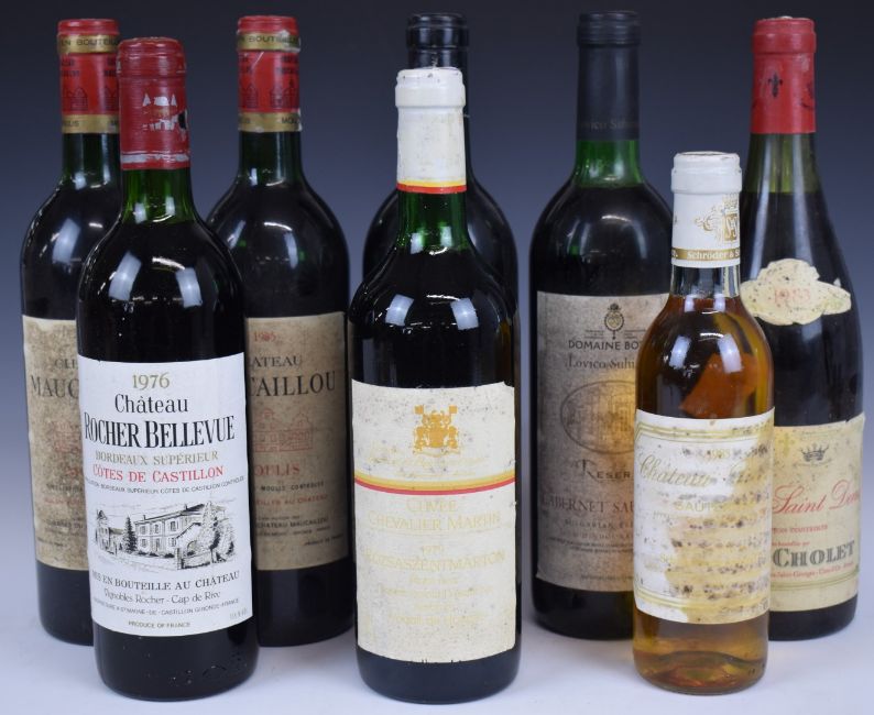 Eight bottles of mostly French wine including two bottles of Chateau Maucaillou Moulis 1985, Chateau Rocher Bellevue 1976, Chateau du Carillon 1989, half bottle of Sauterne etc (8)