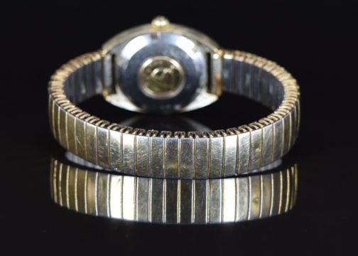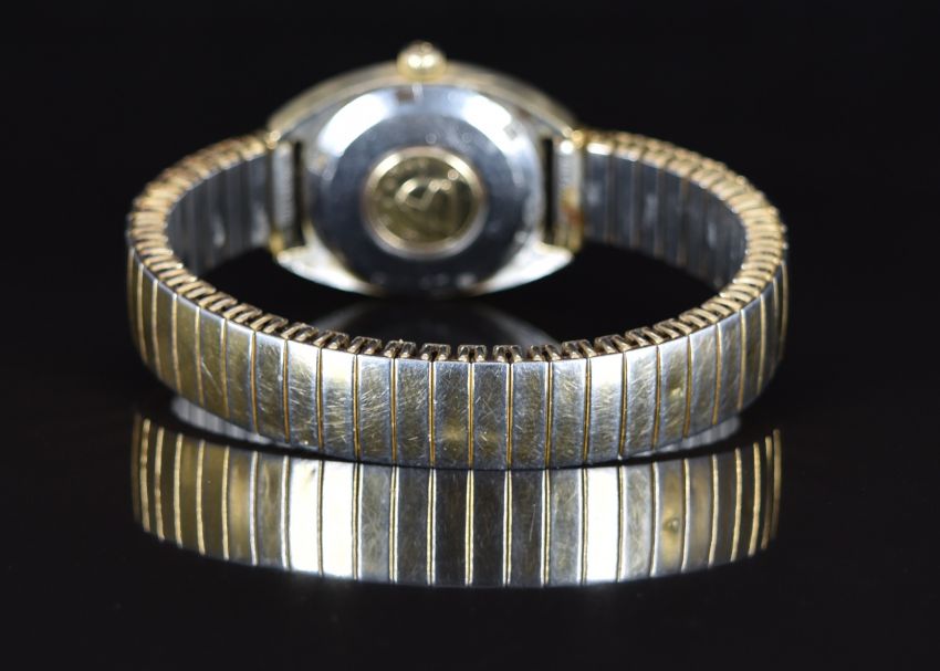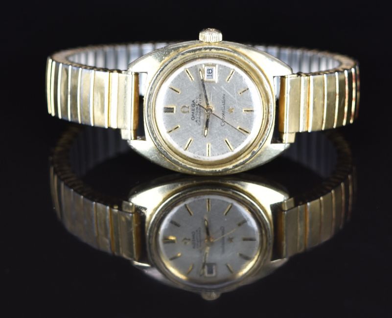 Omega Constellation ladies automatic chronometer wristwatch ref. 568001 with date aperture, luminous hands, two-tone baton hour markers, silver dial, gold plated case and signed movement, on expanding metal bracelet, case diameter 24mm.