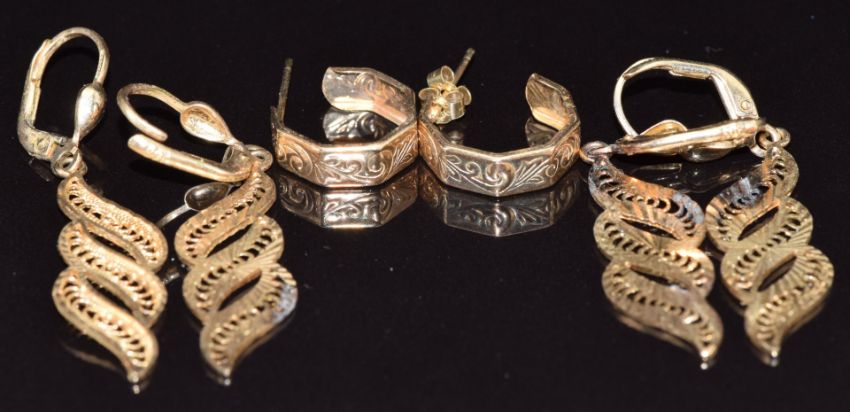 A pair of 9ct gold filigree earrings and two other pairs of 9ct gold earrings, 5g
