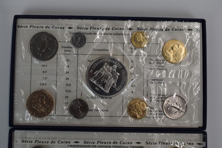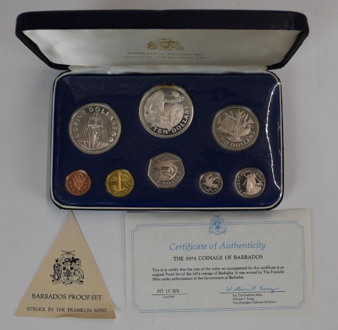 Two Monnaie de Paris 1974 coin sets and a New Zealand proof set, all with silver content, with Coinage of Barbados 1974 proof set and a Cayman Islands proof set, both cased, one with certificate