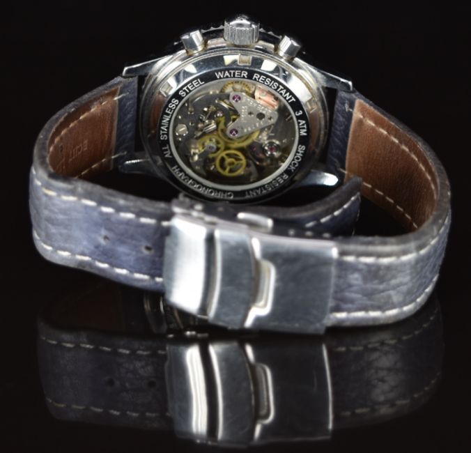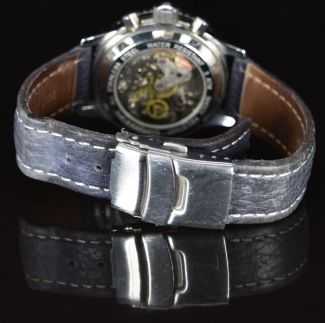 Poljot Blue Angels Navitimer Breitling style gentleman's wristwatch with date aperture, luminous hands, blue dial, white subsidiary dials and inner bezel, stainless steel case, exhibition case back and 23 jewel movement, on blue leather strap, case diameter 40mm.