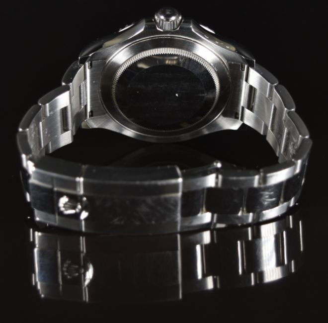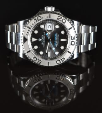 Rolex Oyster Perpetual Date Yacht-Master gentleman's automatic wristwatch ref. 116622 with date aperture, luminous hands and hour markers, blue centre seconds hand, slate dial, platinum bezel, stainless steel case and signed calibre 3235 movement, on stainless steel bracelet, case diameter 40mm, serial number EC761784, in original case with outer box, related paperwork, charms and spare bracelet link.