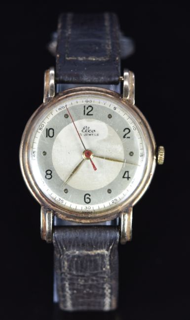 Elco 9ct gold gentleman's wristwatch with gold hour and minutes hands, red centre seconds hand, champagne dial and 15 jewel movement, on brown leather strap, case diameter 32mm.