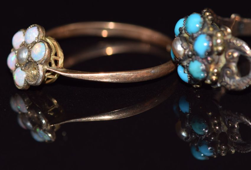 Victorian 9ct gold ring set with a pearl and turquoise, Birmingham 1866, and an Edwardian 9ct gold ring set with opals, in vintage box, 2.6g