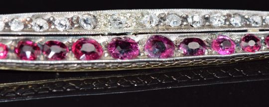 Victorian brooch of elongated boat shape set with diamonds and rubies, each end set with a further ruby, length 8.2cm, 6.8g