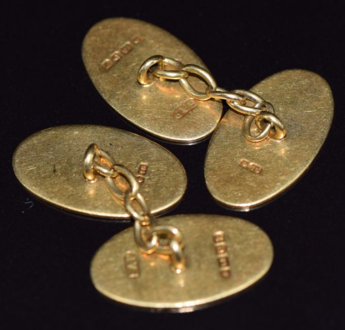 A pair of 18ct gold cufflinks with engine turned decoration, 6.1g