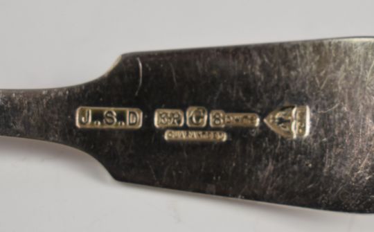 Hallmarked silver cutlery comprising ladle, fork, pair of salt spoons and a further salt spoon, weight 97g, together with a silver plated ladle and a pair of lobster eaters