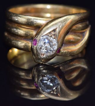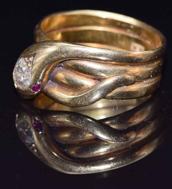 Victorian 18ct gold snake ring set with an old cut diamond and ruby eyes, London 1876, size N, 7.9g
