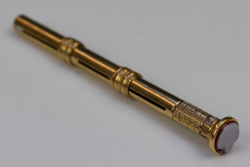 Georgian gold plated propelling fountain pen with calendar to top dated 1823