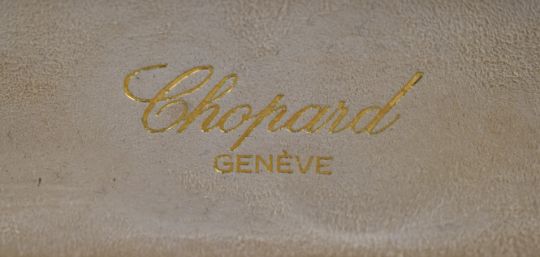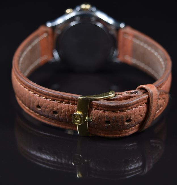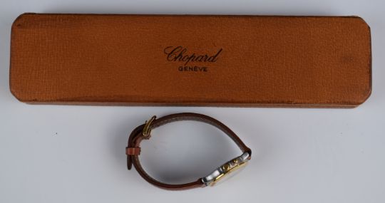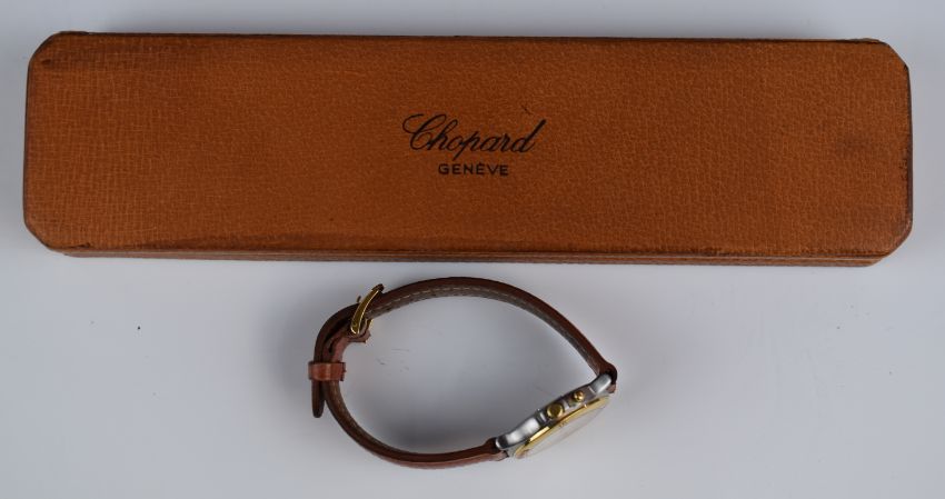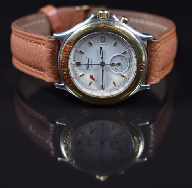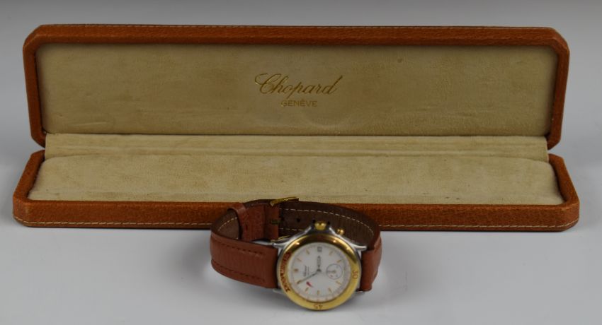 Chopard Mille Miglia wristwatch ref. 8142 with date aperture, subsidiary seconds dial, luminous hands, gold hour markers and bezel, white dial, stainless steel case and quartz movement, on brown leather strap, case diameter 33mm, serial number 286188, in original box.
