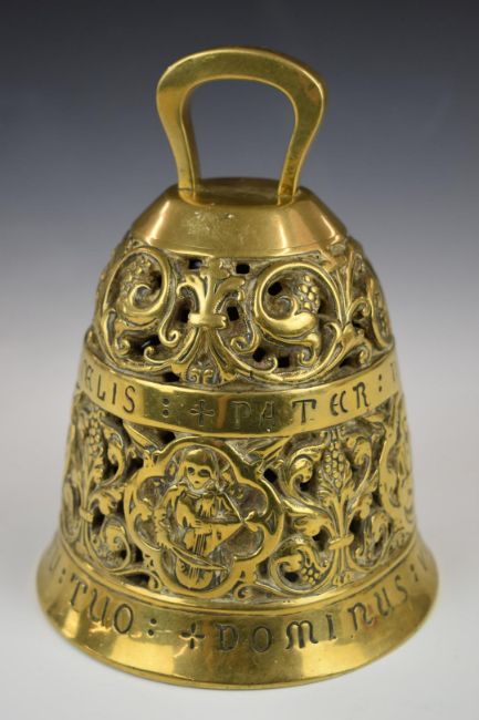 A heavy relief mould and pierced brass bell with figural decoration and Latin script, H19cm