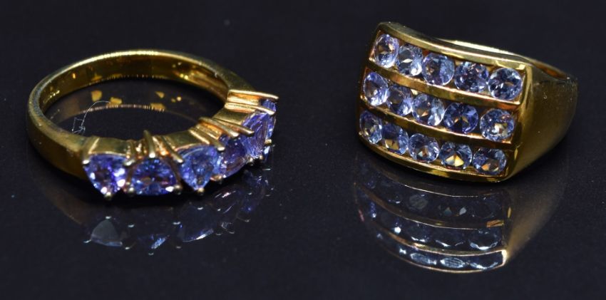 Two 9ct gold rings set with tanzanites, size N, 7.3g