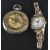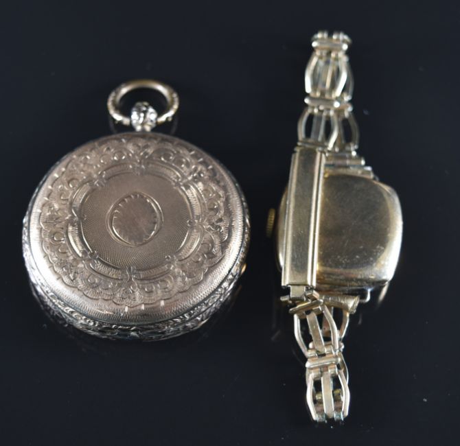 Two gold watches comprising a 14ct gold open faced pocket watch with blued hands, Roman numerals, gold dial and engraved case case diameter 37mm, serial number 55775, 29.5g and a 9ct gold ladies wristwatch with subsidiary seconds dial, blued hands and silver dial, on rolled gold bracelet, case diameter 21mm, 14.1g.
