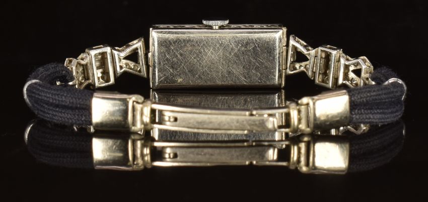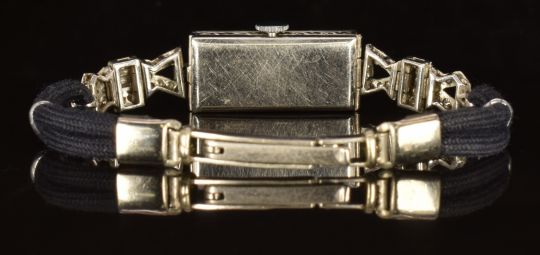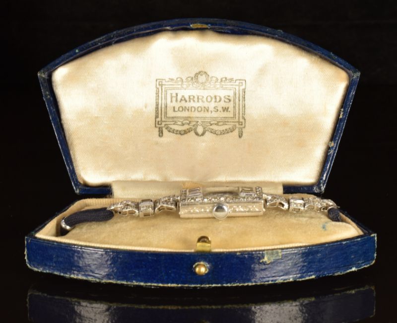 Art Deco platinum diamond set ladies wristwatch with blued hands, black Arabic numerals, silver dial and Swiss 18 jewel movement, on black strap, case width 11mm, in original Harrods box.