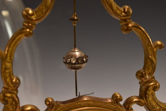Brevette of Paris 19thC exhibition mystery clock, the pierced dial centre with Roman enamelled chapter ring, crown wheel escapement, marcasite decoration and gilt skeleton mount, under glass dome and raised on wooden plinth, H37cm