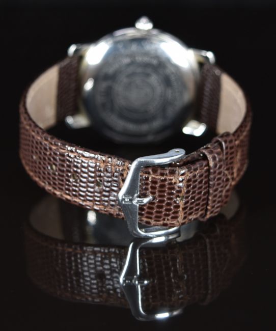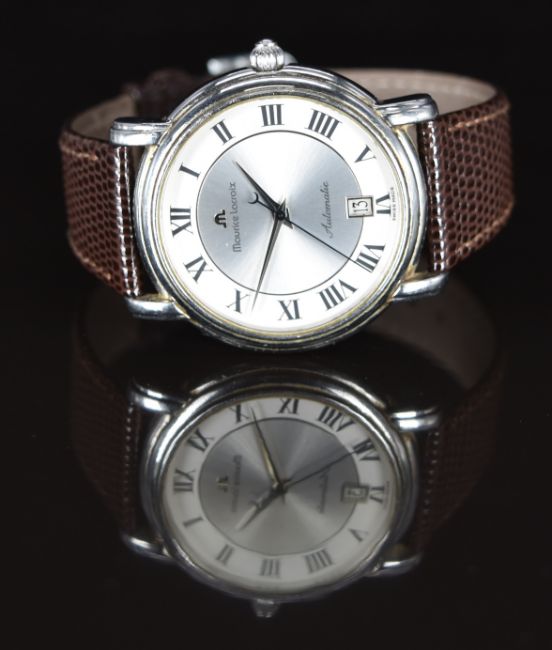 Maurice Lacroix Pontos gentleman's automatic wristwatch ref. 68775 with date aperture, silver dauphine hands, blued centre seconds hand, silver dial, black Roman numerals, stainless steel case and ETA calibre 2824-2 movement, on brown leather strap, case diameter 38mm, serial number 4327.
