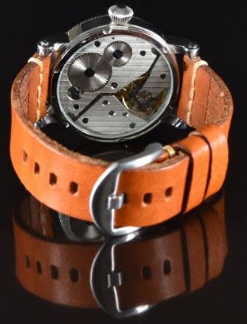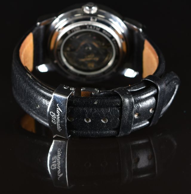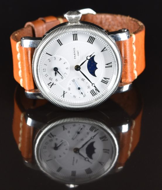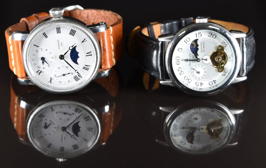Two gentleman's wristwatches comprising Parnis GMT with blued Breguet hands, moonphase, black Roman numerals, white dial and exhibition case back, on brown leather strap, case diameter 42mm and Aeromatic automatic with moonphase, 24 hour dial, visible escapement and exhibition case back, on black leather strap, case diameter 41mm, limited edition 57/200.