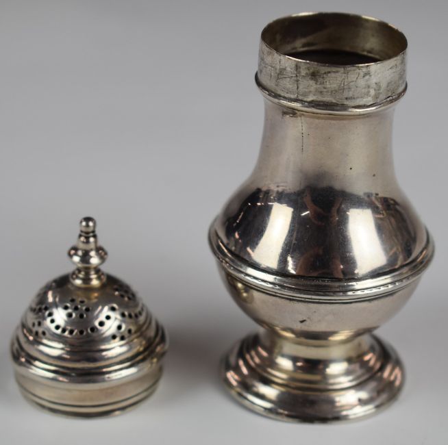 Georgian hallmarked silver pepper, London 1752, maker Jabez Daniell, height 11cm, weight 69g