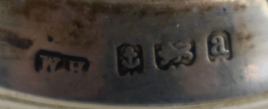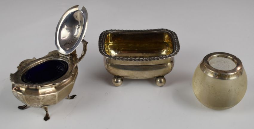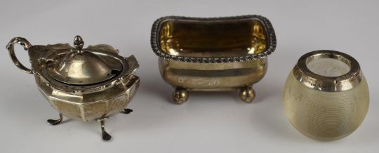 Georgian Scottish hallmarked silver open salt with gadrooned edge and gilt interior, Glasgow 1824, maker John Mitchell, Edward VII hallmarked silver mustard with blue glass liner, Birmingham 1901, maker Goldsmiths & Silversmiths Co Ltd and a Victorian hallmarked silver mounted match striker, Birmingham 1900, maker likely William Hutchinson, weight without glass liner and match striker 180g
