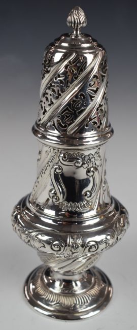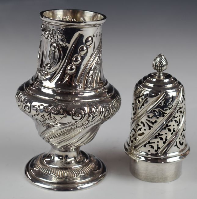Victorian hallmarked silver sugar caster with wrythen and embossed decoration, London 1890, maker Martin, Hall & Co, height 21cm, weight 306g