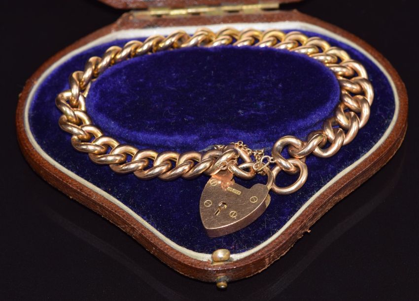 A 15ct rose gold curb link bracelet with heart padlock/ clasp, in original box, 22.7g