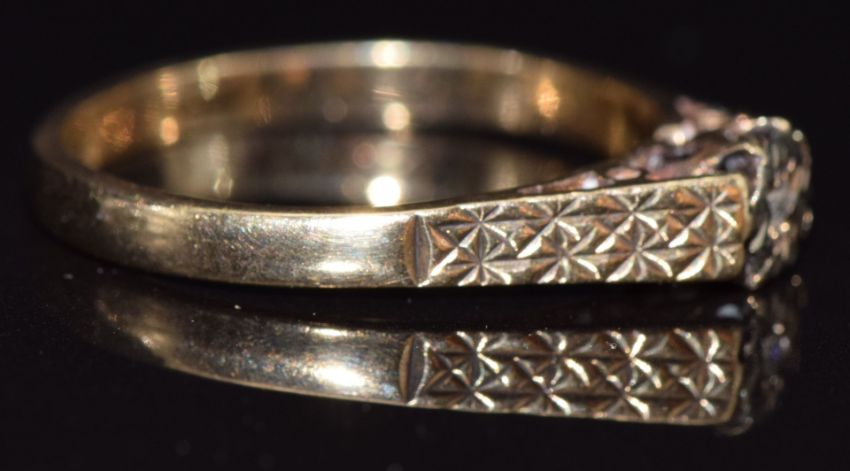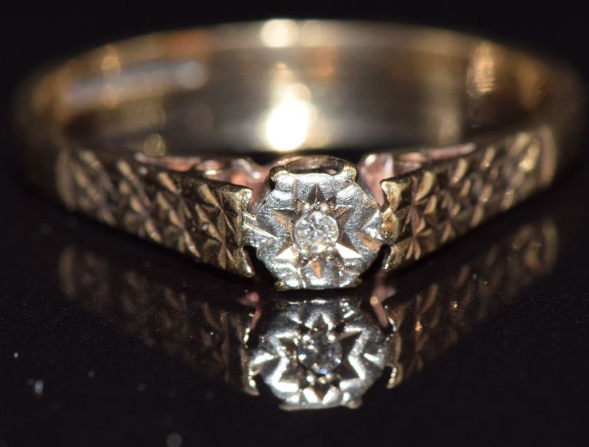 Three 9ct gold rings, one set with a diamond, 7.2g