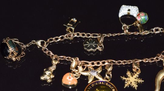 A 9ct gold charm bracelet with nine 9ct gold charms including starfish, swivel fob, handbag, snowflake, etc, 13.2g