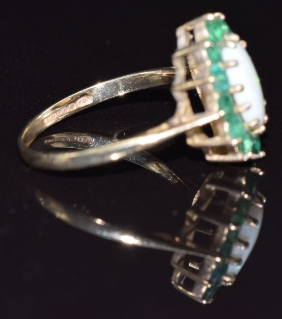 A 9ct gold ring set with an opal surrounded by emeralds, size K, 1.9g