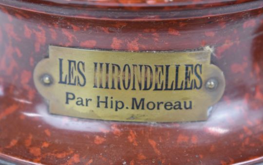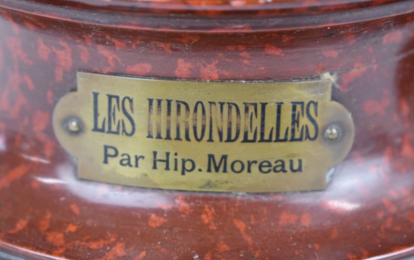 A pair of patinated spelter figures after Hippolyte Moreau 'Les Roses and Les Hirondelles' on socles, H58cm