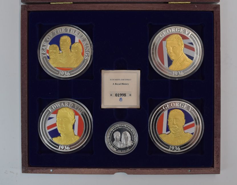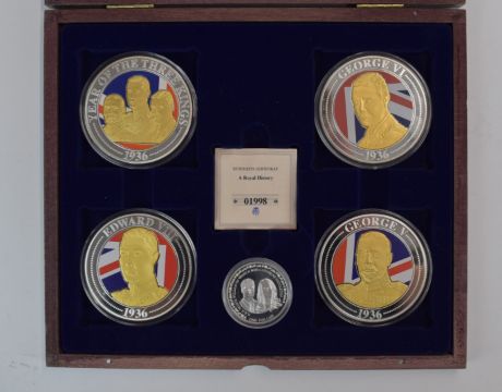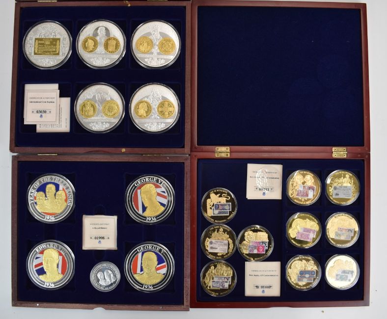 Three cased proof coin sets comprising History of British Coinage 70mm silver and gold plated examples, Year of the Three Kings and British banknotes and 50mm coins, some with certificates