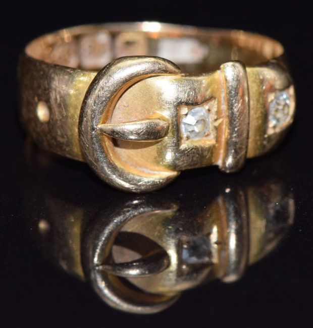 Victorian 18ct gold buckle ring set with two old cut diamonds, Birmingham 1878, size H/I, 3g