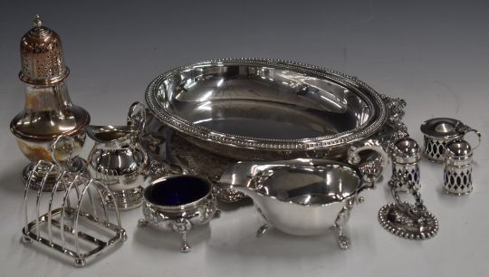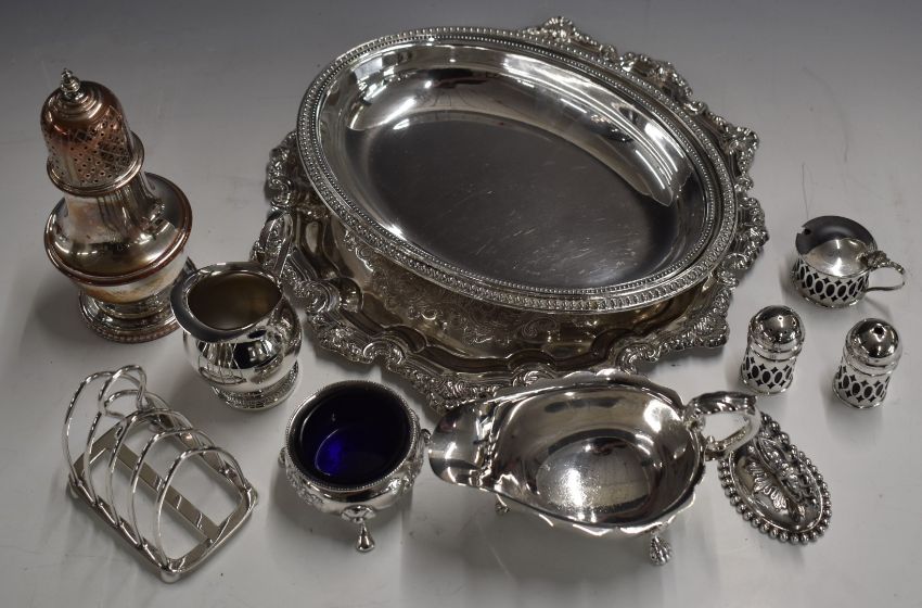 Silver plated ware to include tray, width 30.5cm, sugar caster, toast rack and sauce boat