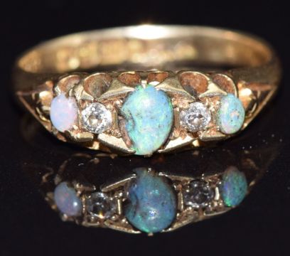 An 18ct gold ring set with opals and diamonds, Chester 1905, size M, 3g
