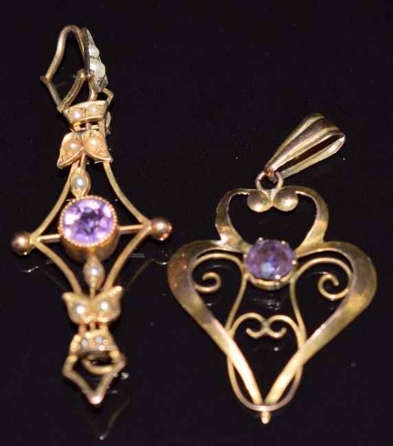 Two Edwardian 9ct gold pendants, one set with amethyst and seed pearls, 3g