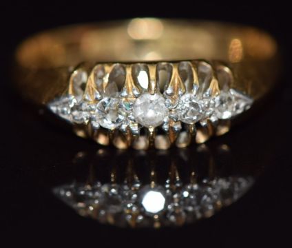 An 18ct gold set with five diamonds, in antique box, size M, 2.7g