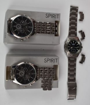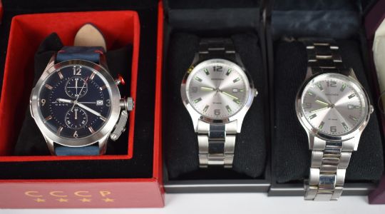 Eight various gentleman's wristwatches comprising CCCP diver's style chronograph ref. CP-7033, Accurist chronograph, Lorus Sports alarm chronograph ref. V071-0100, Casio alarm chronograph ref. 593, two Sekonda dress watches and two Spirit watches, all but one in original boxes.