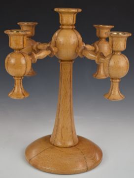 Arts and Crafts turned light oak four branch pedestal candelabra, diameter 32cm, H34cm