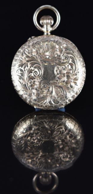 Unnamed 14ct gold keyless winding open faced pocket watch with blued hands, black Roman numerals, engraved gold dial, engraved case and unsigned movement, case diameter 31mm, serial number 116891, 21.4g, in original G W Barker of Hammersmith fitted box.