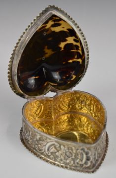 Victorian hallmarked silver heart shaped box dressing table box with bulbous tortoiseshell lid, Birmingham 1892, maker Nathan & Hayes, length 9.5cm