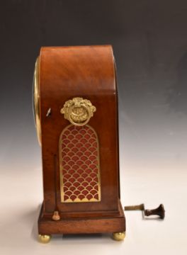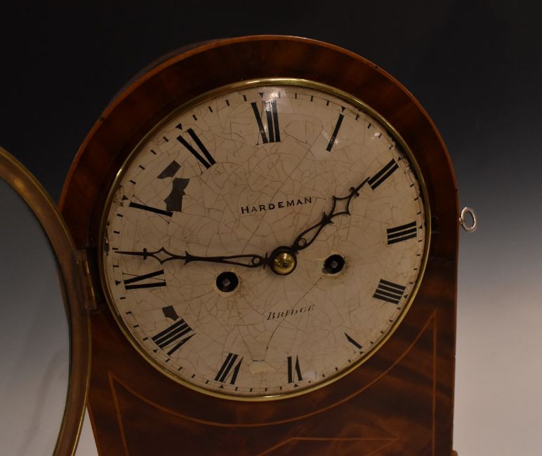 Late Georgian mantel clock by Hardeman of Bridge (makers 1749-1839) in flame mahogany arch top case with string inlay, the white enamel Roman dial to the eight day twin fusee movement striking and repeating on a bell the backplate engraved with maker's name, the whole raised on brass ball feet, H36cm
