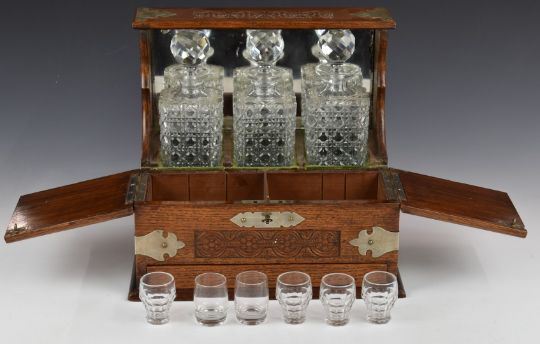 Late 19th or early 20thC oak three bottle tantalus, with twin flaps opening to reveal six drinking glasses and secret drawer below housing games, overall size W35 x D25 x H32cm