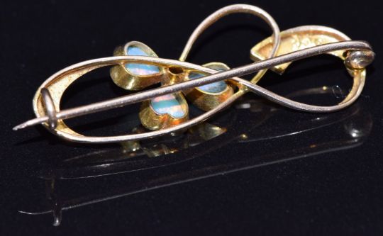 Edwardian 9ct gold brooch set with heart shaped opals and a demantoid garnet forming a clover/ shamrock, 1.7g