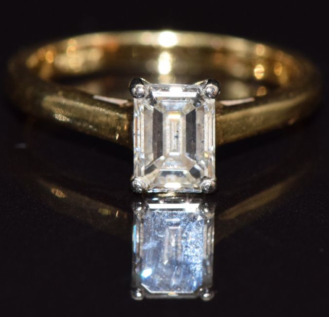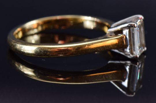 An 18ct gold ring set with an emerald cut diamond of approximately 0.7ct, size K, 3.2g